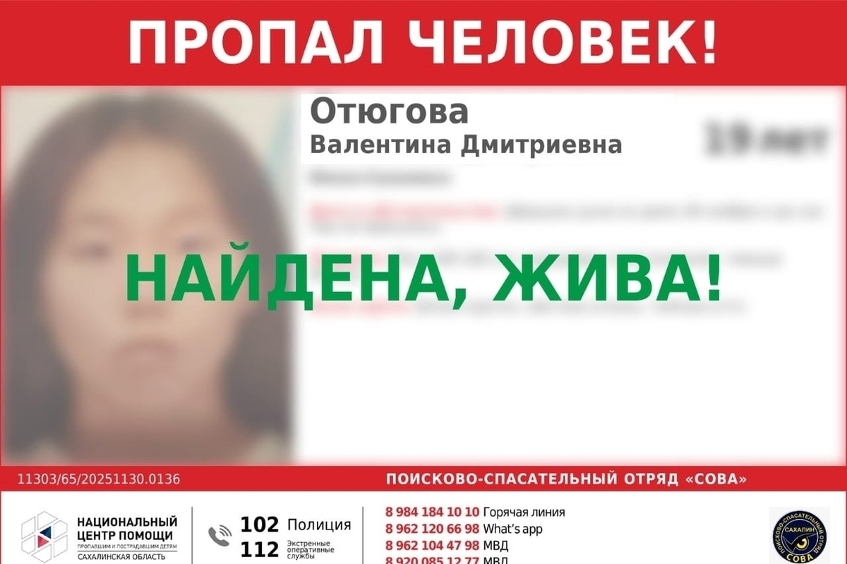 В Южно-Сахалинске успешно завершились поиски 19-летней Валентины Отюговой, которая перестала выходить на связь 28 ноября.